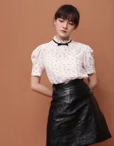 写真中,文淇身着一件浅色系的小碎花上衣,清新的碎花图案自带浪漫特点,充满了夏日的甜美气息。上衣的领口设计别致,恰到好处地展现了她的颈部线条。而她标志性的短发微微打理,更添几分俏皮与活力。