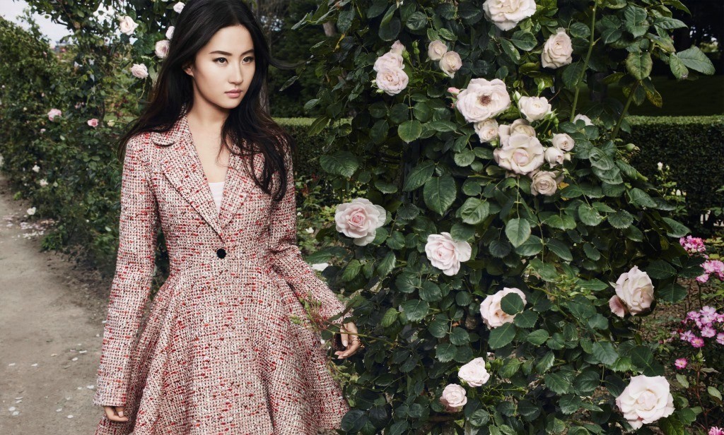 画面中,刘亦菲身着设计精美的服饰,或轻盈飘逸,或精致华丽,与周围繁茂的花朵构成了和谐的整体。