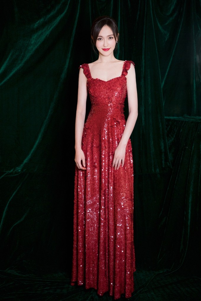 面料的选择为整体造型注入了灵魂。长裙的缎面材质在光影下流淌着柔和而深邃的光泽,从不同角度看去,色泽由浓郁的猩红渐变为柔和的酒红,仿佛自带生命。这种内敛而华贵的光泽感,远比浮夸的亮片更为高级,也让唐嫣在镜头前犹如一颗被精心打磨的红宝石,熠熠生辉。她仿佛在用身体语言告诉观众,真正的奢华是舒适且自然的,是内在气质的自然外溢。