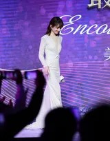 仔细观察这套礼服的设计,深V领口以恰到好处的弧度延伸,不仅勾勒出优美的颈部与锁骨线条,更增添了一份成熟女性独有的从容气场。礼服面料选用带有细腻光泽的材质,在灯光映照下,随着她的每一个步伐流转着如鎏金般华贵的光晕。高腰线与修身剪裁的设计,将她挺拔优雅的身姿衬托得淋漓尽致。