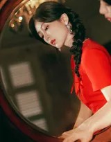 最令人眼前一亮的,莫过于她搭配的个性麻花辫发型。不同于传统辫子的规整,这款发型在编发时刻意保留了些许松散感,几缕碎发自然垂落,既修饰脸型又增添了几分慵懒随性的气息。辫子随着她的动作轻轻摆动,与红裙的飘逸形成巧妙呼应,整体造型在精致与自然之间找到了完美平衡。