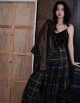 这套穿搭的核心在于单品的巧妙组合:一件基础款黑色吊带背心,搭配一条红黑交织的格纹长裙。吊带背心设计简洁,恰到好处地展现出汤唯优美的肩颈线条,同时为整体造型注入几分清爽感;而格纹长裙则以复古图案和垂坠质感,赋予装扮浓厚的文艺气息。格纹元素历来是时尚界的经典,从英伦风到乡村格调,它总能唤醒人们对质朴与雅致的记忆。汤唯选择的长裙版型宽松,裙摆自然散开,不仅行动自如,更营造出一种慵懒而时髦的氛围。这种搭配看似随意,实则充满心思——它平衡了露肤度与含蓄感,在简约中见层次,正是当下推崇的“松弛风”典范。