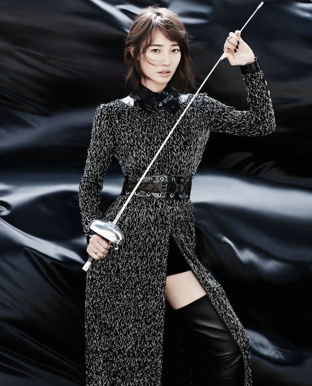 这组大片的核心主题围绕击剑运动展开。白百何身着简约而修身的黑色长裙,手持击剑,其专业姿态与沉静眼神,完美捕捉了这项古老运动所需的专注、敏捷与内在力量。黑白摄影的运用进一步强化了画面的张力,硬朗的线条与柔和的面部轮廓形成对比,在剥离色彩后,更纯粹地凸显了人物与运动本身的美感与气势,打破了公众对她固有的“森女”、“小清新”等银幕印象。