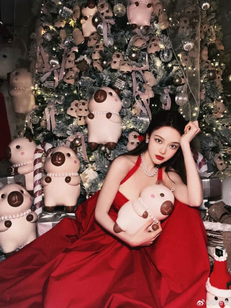 照片中,周扬青选择了一款设计感十足的迷你圣诞连帽裙,将经典的节日色彩与现代时尚巧妙结合[citation:1]。鲜艳的正红色不仅映衬得她肌肤胜雪,更与她身后装饰着彩灯与铃铛的圣诞树相得益彰,瞬间将浓厚的圣诞氛围拉满。这套造型堪称节日穿搭的典范——它既是向传统的致敬,也是对个性时尚的大胆诠释。周扬青以其一贯的精准审美,证明了红色不只是节日的符号,更是彰显自信与魅力的利器。