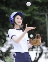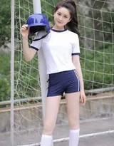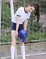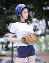 下身搭配的同色系运动短裤,利落剪裁展现出修长而充满力量感的腿部线条。最为点睛的配饰,莫过于那双过膝的高筒运动袜。它们不仅是棒球运动的经典元素,更在视觉上勾勒出流畅的腿部轮廓,与白色的运动鞋一起,构成了从膝到足的活力篇章。这身装扮,既有专业运动的范儿,又不失少女的清新与俏皮,在绿茵场的背景下,显得格外耀眼。