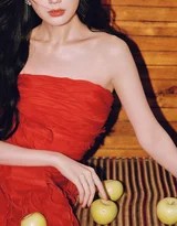 在镜头语言上,这组大片运用了大量特写和中近景,细腻地捕捉了她的面部情绪和身体细节。光线处理尤为出色,多采用侧光或柔和的漫射光,让光线如流水般拂过她的脸庞、肩膀和发丝,勾勒出柔和的轮廓,并在红裙上泛起细腻的光泽。这种用光方式极大地强化了画面的质感与电影叙事感,仿佛每一张照片都是某一部文艺影片中的关键帧,让人不禁想去猜测镜头之外的故事。