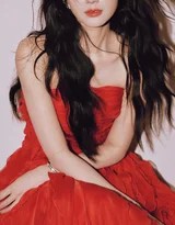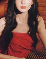 与这抹浓烈红色相映成趣的,是她那一头黑色长卷发。长发被精心烫染成富有弹性和光泽的大波浪,如海藻般浓密,如绸缎般顺滑。它们时而随意披散在肩头、胸前,与红裙交织;时而微微拨向一侧,露出优美的颈部曲线。这头黑发是“慵懒感”的重要载体,它打破了精致盘发所带来的距离感,以一种近乎私密的、刚刚苏醒般的松弛状态,拉近了观者与画面的心理距离。发丝的每一个卷曲弧度,都在柔和的光线下投下细腻的阴影,增强了画面的层次和立体感。