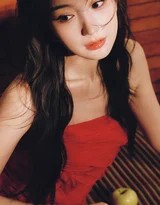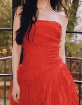 视觉的核心,首先聚焦于那抹极具冲击力的红色。她身着的红色长裙,并非庆典式的张扬正红,而是更偏向酒红或铁锈红的浓郁色调,饱和度极高,蕴含着沉稳的质感。这种红,如凝固的葡萄酒,如傍晚的霞光,自带一种故事感和温度。吊带或修身的设计,恰到好处地展现了她的锁骨与肩颈线条,简约的剪裁将所有的视觉重心让位于色彩本身与穿着者的神态。红色包裹之下,是她白皙的肌肤,形成强烈的色彩对比,肌肤仿佛成了画布上最亮的留白,让整幅画面充满了古典肖像画的韵味。