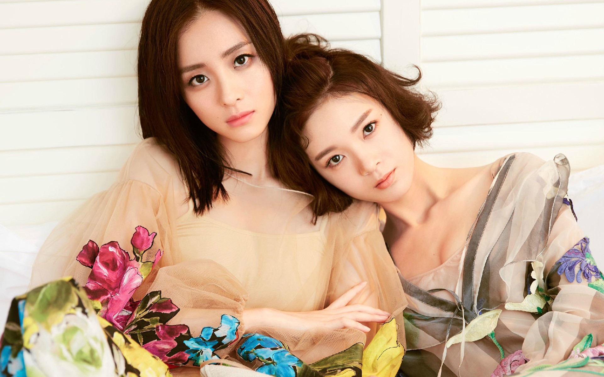 写真整体以白色与浅色系为主调,氛围干净通透。陈瑶与胡冰卿的妆容都近乎素颜,强调肌肤原本的质感与光泽。胡冰卿一直被网友称赞拥有“冷白皮”,肤如凝玉,被誉为“行走的月光”。这种天生的清冷肤色在简单的白衣衬托下,更显透彻明亮。而陈瑶则以其独特的空灵眼神著称,在一组粉白蕾丝裙的写真中,她曾被形容为“眼神空灵似从童话走出的梦幻精灵”。在这组合作写真里,她的眼神同样纯净,带着一丝不谙世事的朦胧感,与胡冰卿的清澈沉静相得益彰,构成了画面中动人的情绪内核。