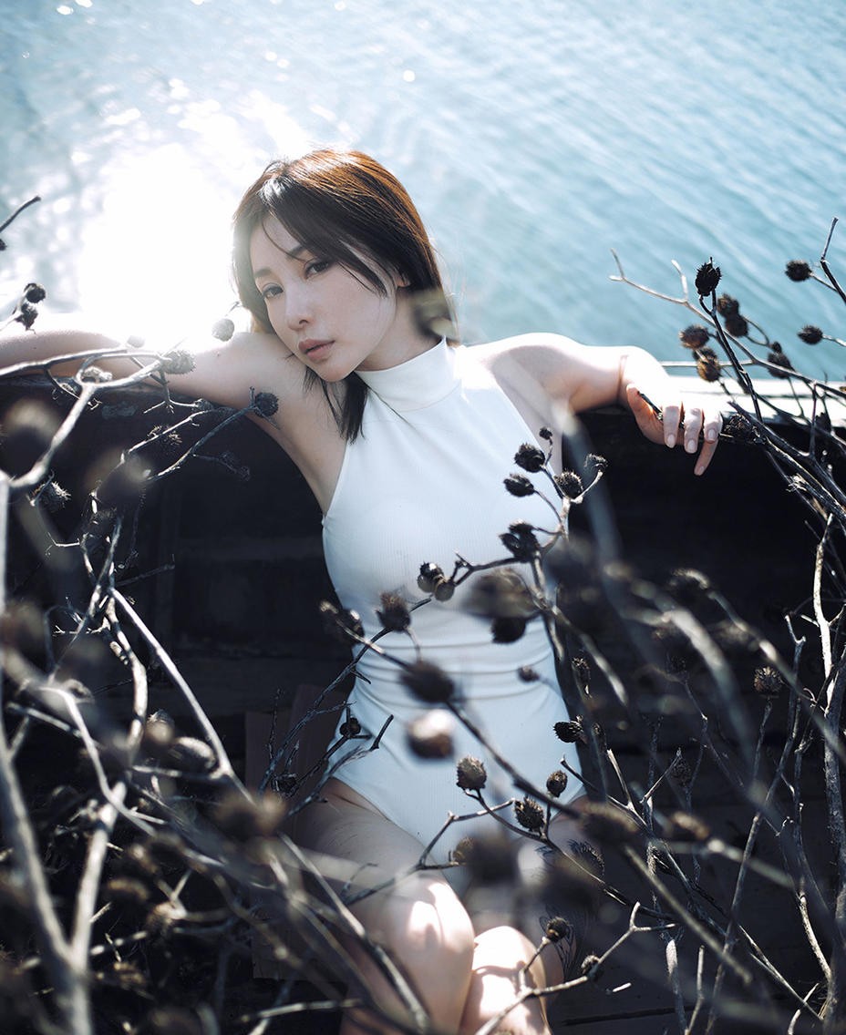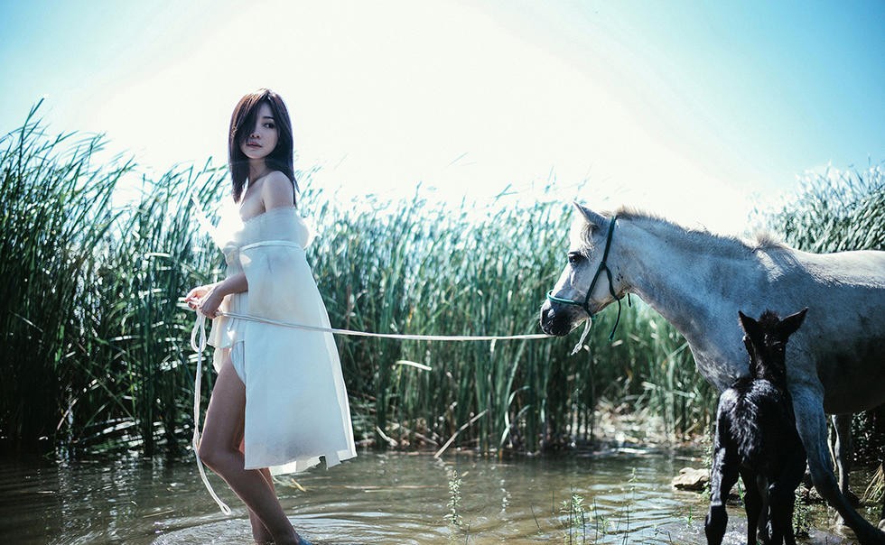 湿发,是这组写真的灵魂所在。微微粘连的发丝,少了几分刻意的精致,却多了几分自然的生命力和不经意的诱惑。它仿佛刚离开水面,又似被薄汗轻濡,这种状态下的柳岩,展现出一种介于率真与娇媚之间的独特气质。镜头下的她,一袭挂脖长裙紧裹身段,裙身上可能缀有亮片,在水光映衬下折射出细碎光芒,与湿润的肌肤质感相映成趣。水流沿着身体的曲线蜿蜒而下,不仅凸显了其傲人的身材比例,更让整个画面充满了动态的叙事感。