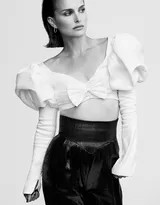 大片中,娜塔莉·波特曼的造型堪称经典黑白主义的时尚范本。黑色服装占据了主导,无论是利落的无袖上衣还是经典的吊带裙,都通过精准的剪裁凸显出她纤细的身材曲线。黑色所带来的神秘与优雅,与她白皙的肌肤和沉稳的气质相得益彰。其中,深V领的设计巧妙成为了造型的点睛之笔,它不仅拉长了身体线条,更在含蓄中流露出恰到好处的性感,展现了一种低调的奢华感。